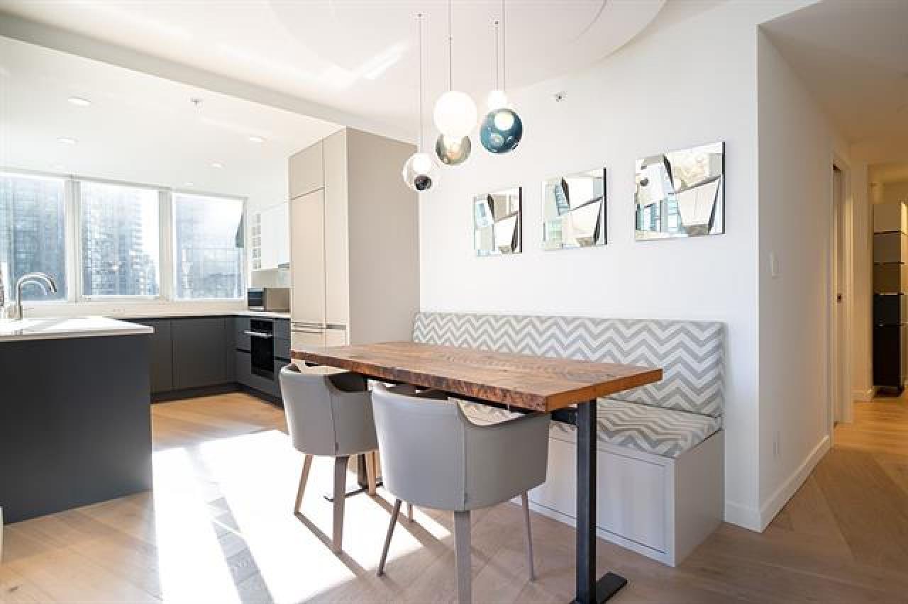 Welcome to this one of a kind suite at Harbourside Park, in Coal Harbour. Fantastic downtown living or would make for a phenomenal pied-a-terre in the city. This coveted -06 Floorplan unit has been meticulously renovated with high standards and with many details. Wonderful mountain, water, and city views from the Living, Dining, Kitchen and Balcony. One bedroom, plus a den/solarium, along with an extremely unique flex space. Herringbone hardwood floor, clever storage and space saving features throughout the home. Kitchen design is extremely efficient. Heated bathroom floor with a high tech Japanese toilet. Bonus 2 Parking Stalls and 2 Storage Lockers. Amenities in the building include a pool, hot tub, and gym. Located just off the seawall, near the marina and the community centre.
