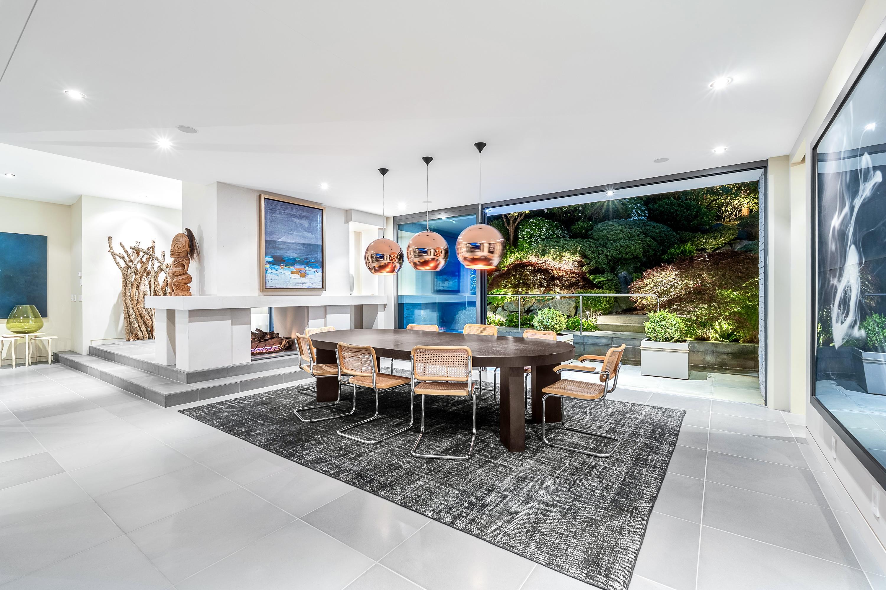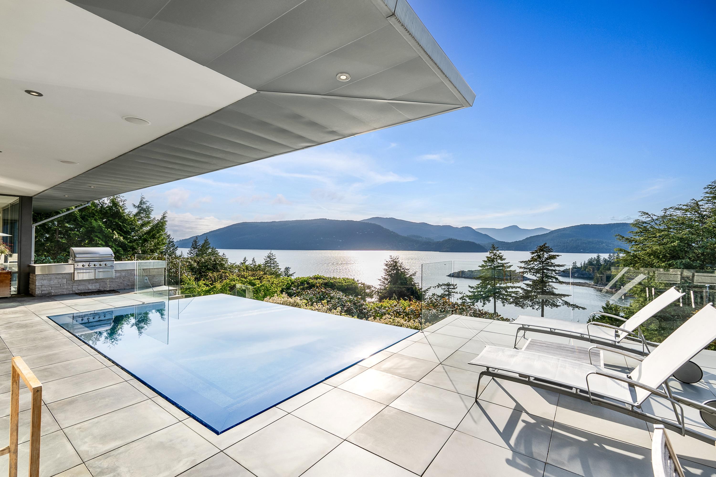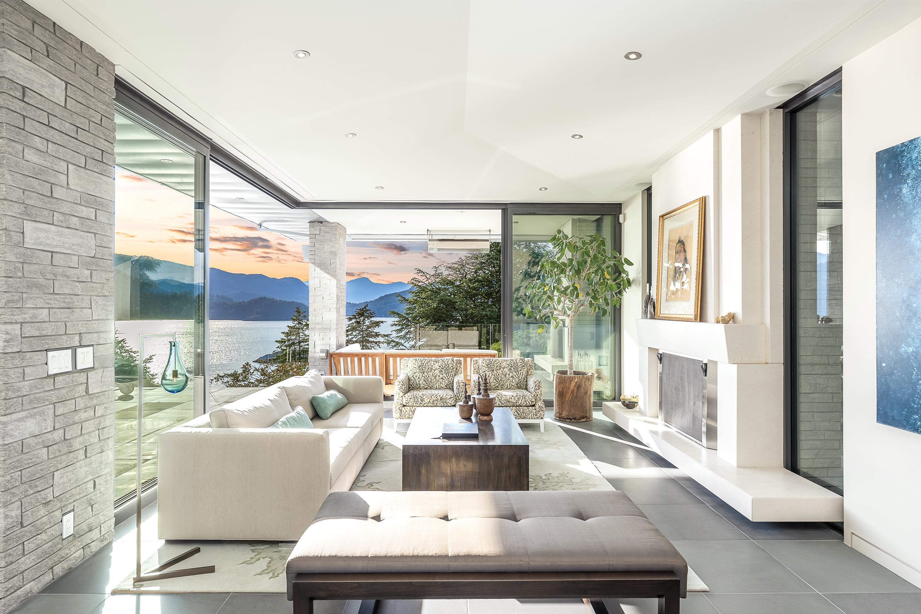 Perched above Howe Sound, the home captures uninterrupted, gallery-worthy vistas of the ocean, islands, and Snug Cove. Retractable floor-to-ceiling glass walls dissolve the boundary between indoors and out, opening to an expansive terrace with a flush-mounted, four-sided negative-edge infinity pool, cascading water feature, and a grand gas fireplace, designed as much for contemplation as for gathering.