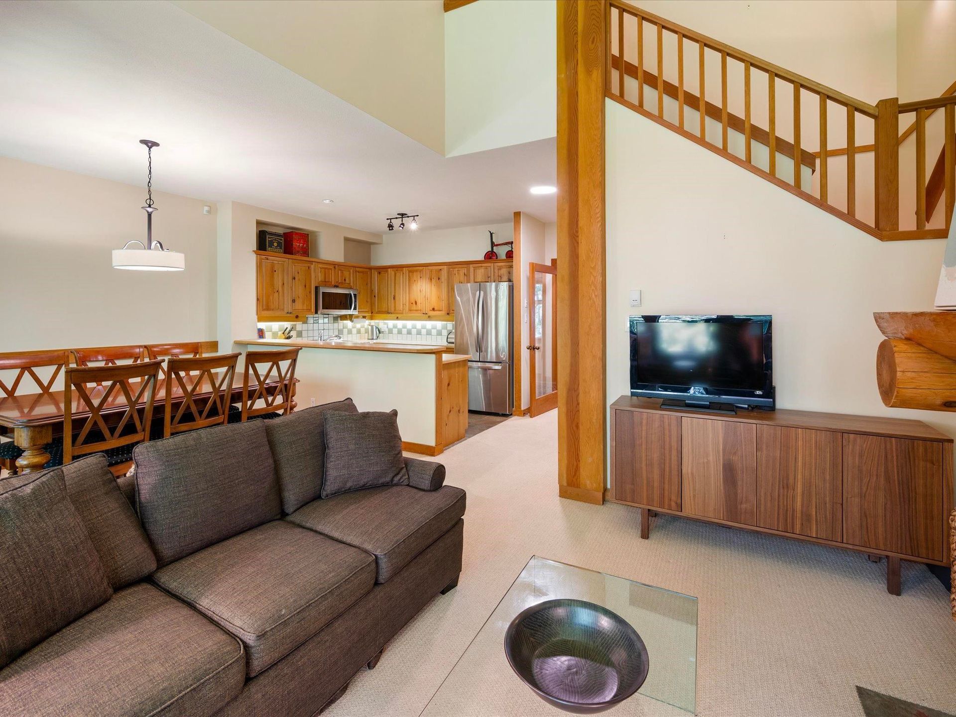 Enjoy year-round Whistler adventures from this ideally located ski-home with easy access to Lost Lake’s XC, biking & hiking trails, and steps from the Chateau Golf Course. The open floor plan welcomes natural light through a large window wall and sliding doors to a covered patio with creek sounds and a private treed outlook. Features include three well-proportioned bedrooms, a cozy fireplace, and a covered hot tub deck to unwind after mountain days. Zoned for nightly rentals with unlimited owner use, this low-maintenance retreat offers strong revenue potential and a private single-car garage. No GST.